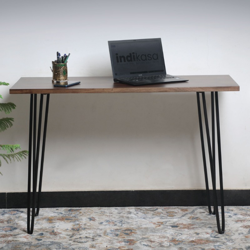 Our Charlie study table cum console is that quintessential item from the Indikasa label: demure yet tough, archetypal as well as nomadic. This stand-alone Sheesham wood table with no bells and whistles can alternate as a console too. The legs moulded in iron can easily yield multiple out-of-the-box ways in which it can enhance the look of your interiors. Check out this durable and stable piece in walnut finish to adorn your home. Without a hitch, move it from the study room to the workstation to the hallway with equal success. It is hard to give this elegant and simple piece a miss with its knotty grains and unique texture, uttering an adoring “see you again” appeal.