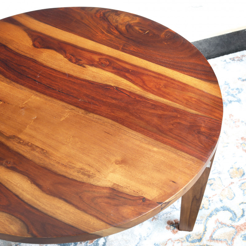 An idyllic piece of centre table—that’s how we like to portray our Nirvana centre table. The aesthetic appeal of the design and the golden lustre on the surface of the table is sure to grab eyeballs wherever it is placed in your home. The Sheesham wood lends it a natural sheen infusing it with a medium to grainy texture. A highly-sought-after piece pictured here in teak finish, it is certain to attract everyone’s attention to it like bees to honey. The unpretentious craftsmanship visible in the strong legs is another reason to take home this beauty right away.